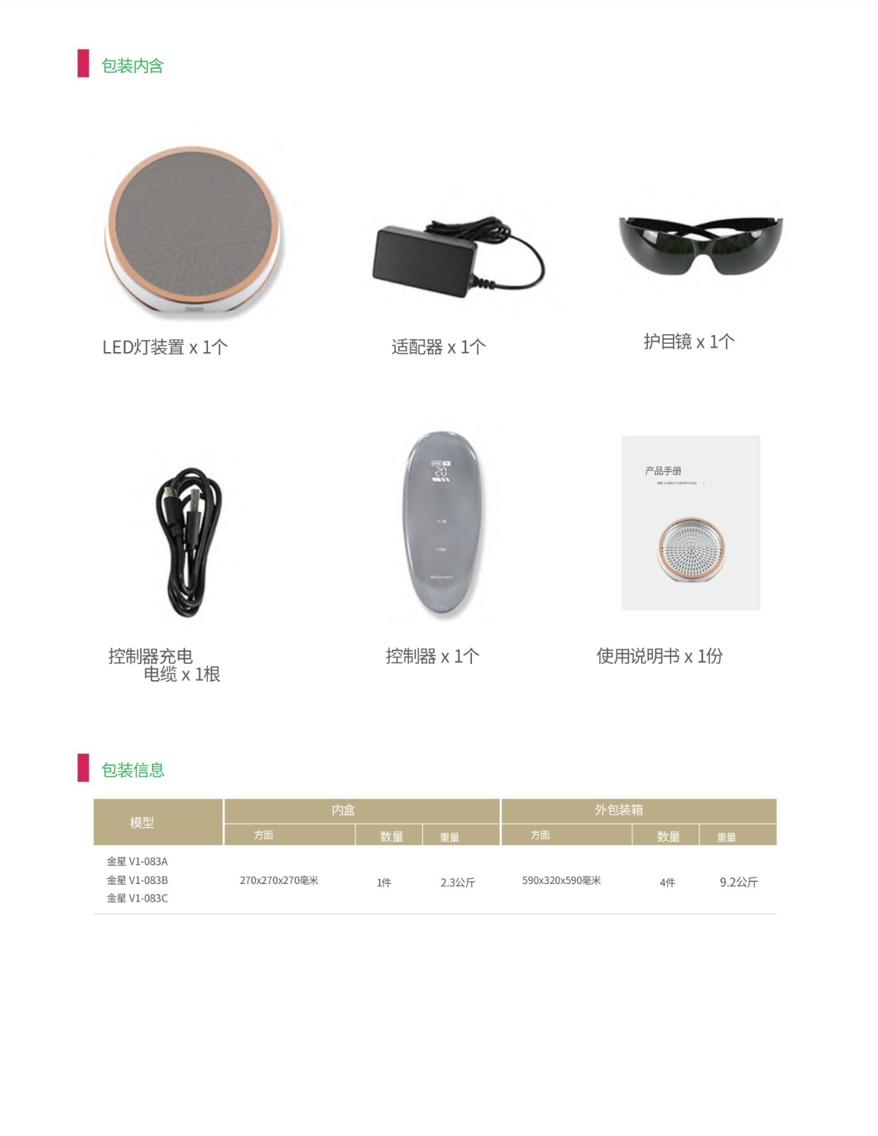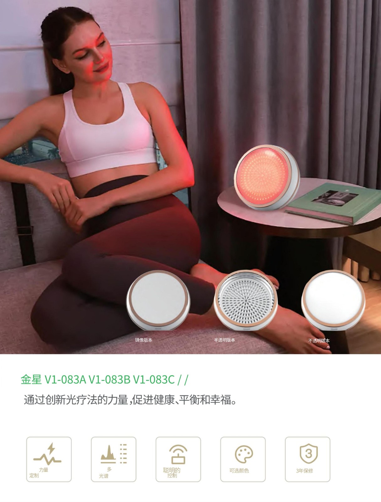 设计:便携式圆形设备,内置高密度LED灯珠,采用金属/白色外壳。